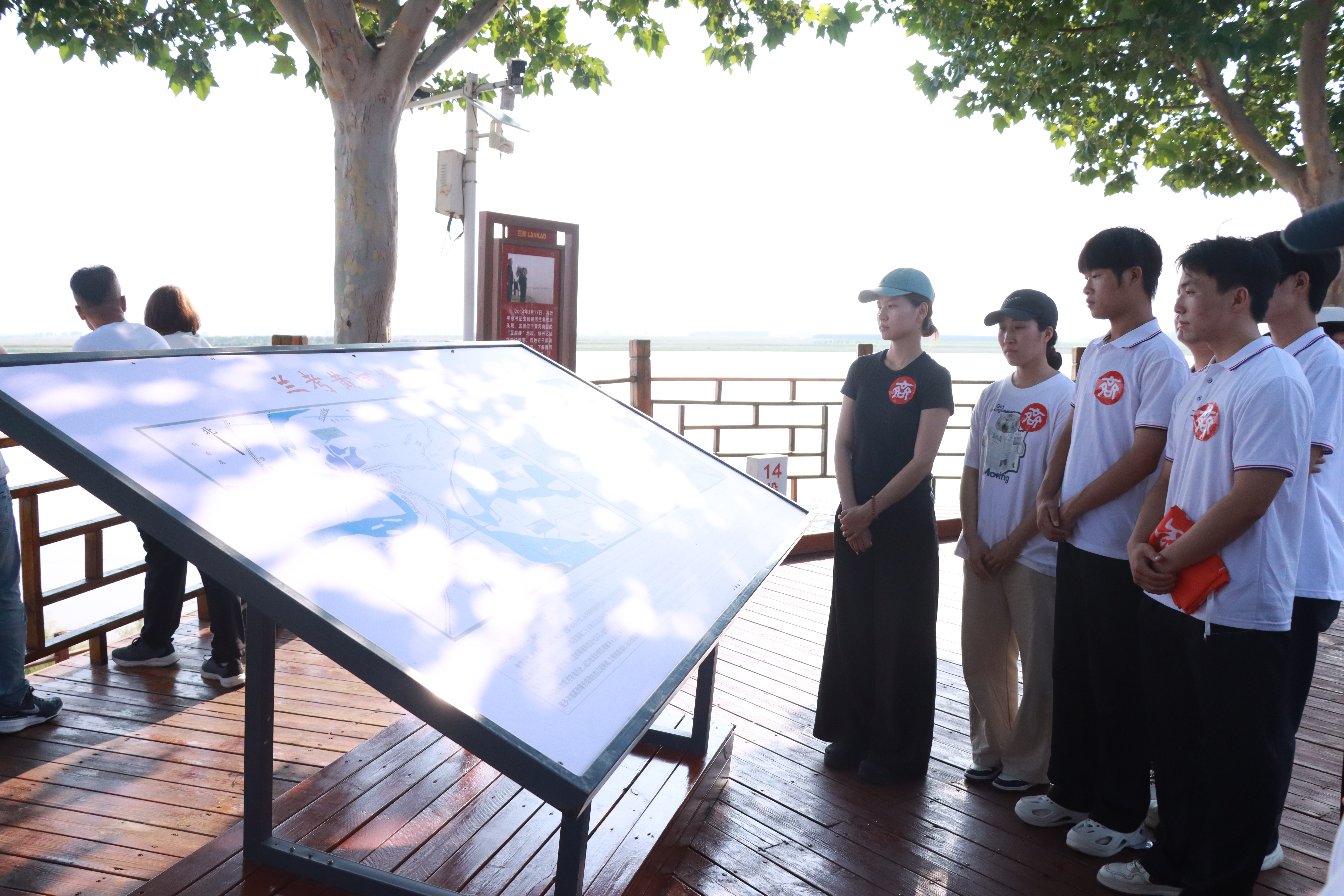 随后董会老师带领学生前往东坝头黄河治理展览馆。馆内丰富的史料和实物,生动展现了兰考人民在党领导下治理黄河、改造家园的奋斗历程。站在黄河大堤上,面对滔滔黄河水,董会老师讲述了兰考过去频发的自然灾害,以及防风固沙工作对保障人民生活、促进经济发展的重大意义。现场师生们深受触动,齐声高唱《黄河大合唱》,激昂的歌声在黄河上空回荡,唱出了对先辈的敬仰,更表达了传承和弘扬焦裕禄精神的坚定决心。