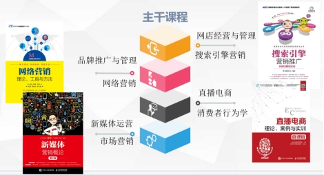 网络营销、直播电商、搜索引擎营销、品牌推广与管理、网络广告新媒体营销、社群营销、管理学、电子商务基础与应用、市场营销、商务谈判、电子商务技能训练、商务数据分析与应用、商品信息采编消费行为学、经济学基础、电子商务法律法规、经济法、商务礼仪、网店经营与管理、电子商务客户服务等。