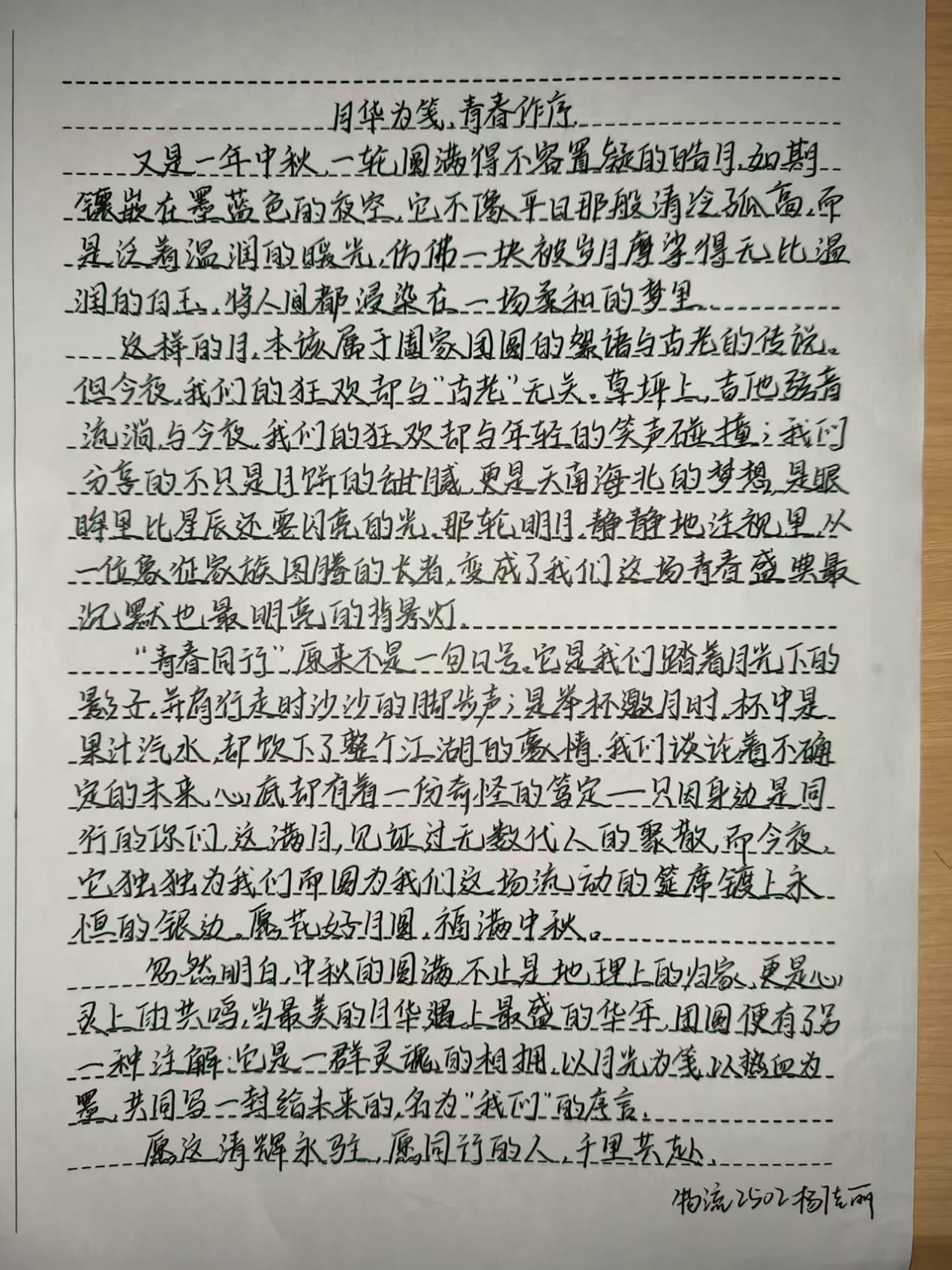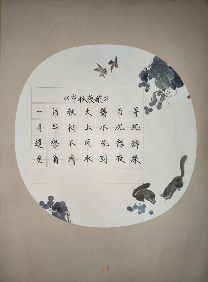 活动现场,学子们以笔为媒,将中秋元素与青春感悟融入创作。手抄报比赛中,同学们围绕“中秋传说”“家国情怀”主题展开构思,以细腻笔触勾勒嫦娥奔月、玉兔捣药的经典场景;书法比赛现场则墨香四溢,软笔组学子挥毫泼墨,“中秋安康”“喜乐团圆”等词句在宣纸间流淌,硬笔组作品则以工整笔触展现青年的严谨与朝气,一幅幅作品既饱含对传统节日的敬意,更传递出新时代青年的精神风貌。