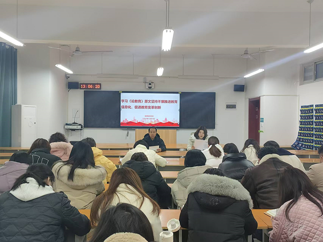 接着,全体教师共同学习了习近平同志《论教育》中关于《坚持不懈推进教育信息化,促进教育变革创新》和《教育合作是增进人民了解和友谊的重要渠道》的相关内容。文章指出,当今世界,科技进步日新月异,因应信息技术的发展,推动教育变革和创新,构建网络化、数字化、个性化、终身化的教育体系,建设“人人皆学、处处能学、时时可学”的学习型社会,培养大批创新人才,是人类共同面临的重大课题。要坚持不懈推进教育信息化,努力以信息化为手段扩大优质教育资源覆盖面,积极推动人工智能和教育深度融合,促进教育变革创新,充分发挥人工智能优势,加快发展伴随每个人一生的教育、平等面向每个人的教育、适合每个人的教育、更加开放灵活的教育。