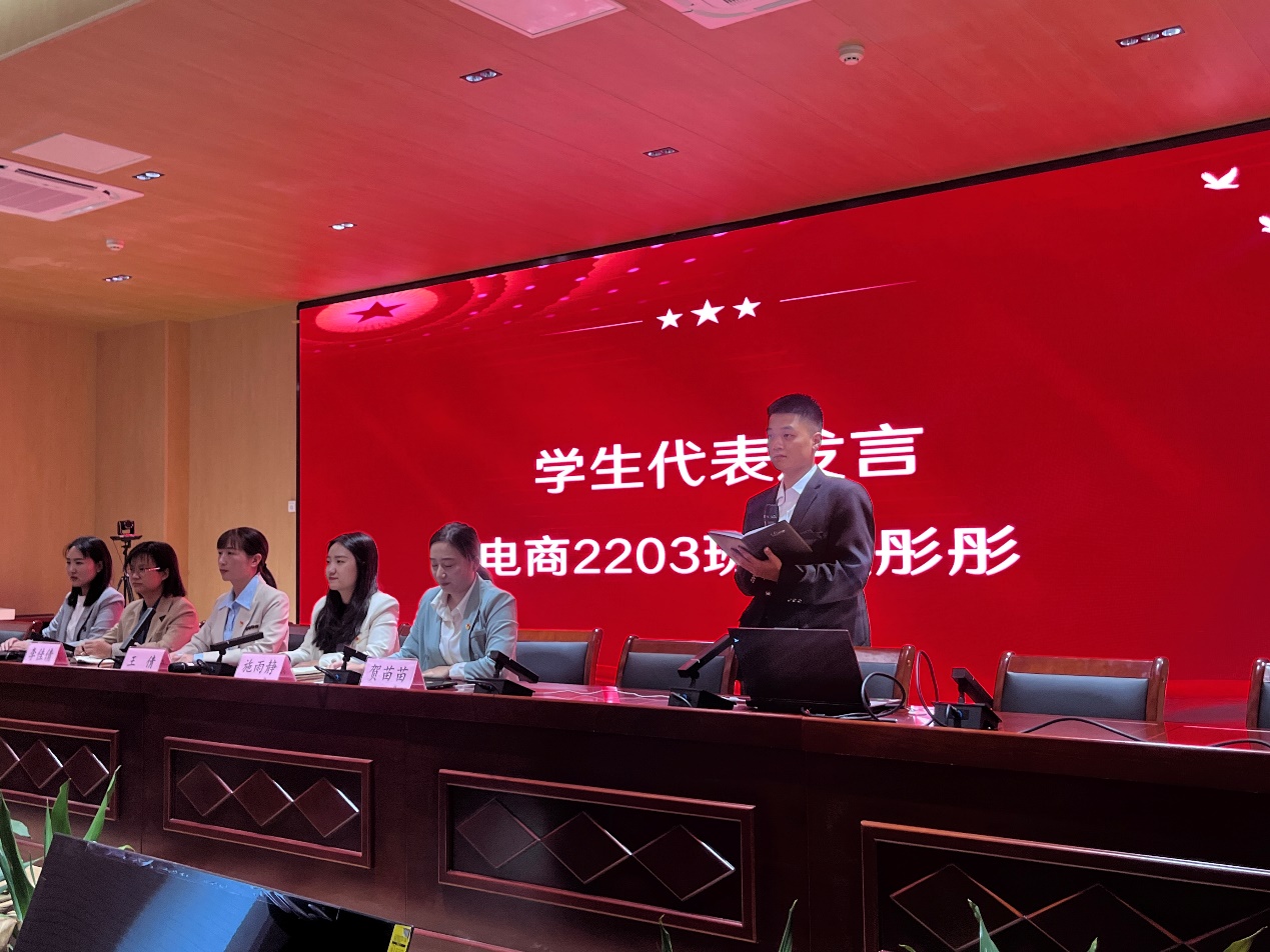 电商2203班铁彤彤同学作为学生代表进行发言,希望通过本次培训班锤炼理想信念,能够做到知行合一,学有所思、学有所获、学有所成。