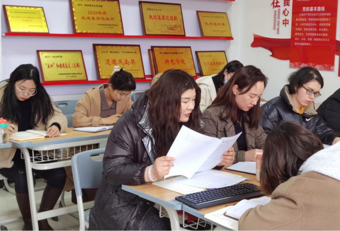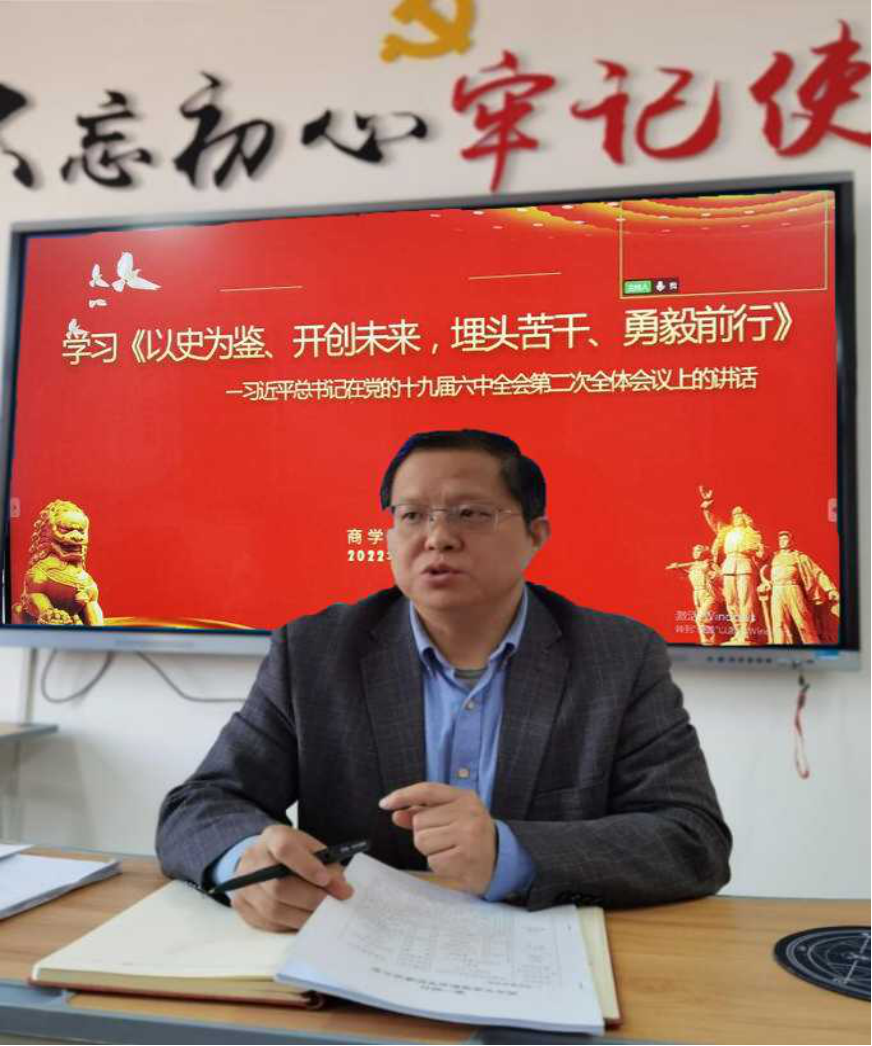 会上,办公室主任刘嘉慧领学了习近平总书记在党的十九届六中全会第二次全体会议上的讲话《以史为鉴、开创未来、埋头苦干、勇毅前行》,团总支书记李力、教学办主任王珂、学工办公室主任刘超领学了2022年全省教育工作会议中的十项重点工作。