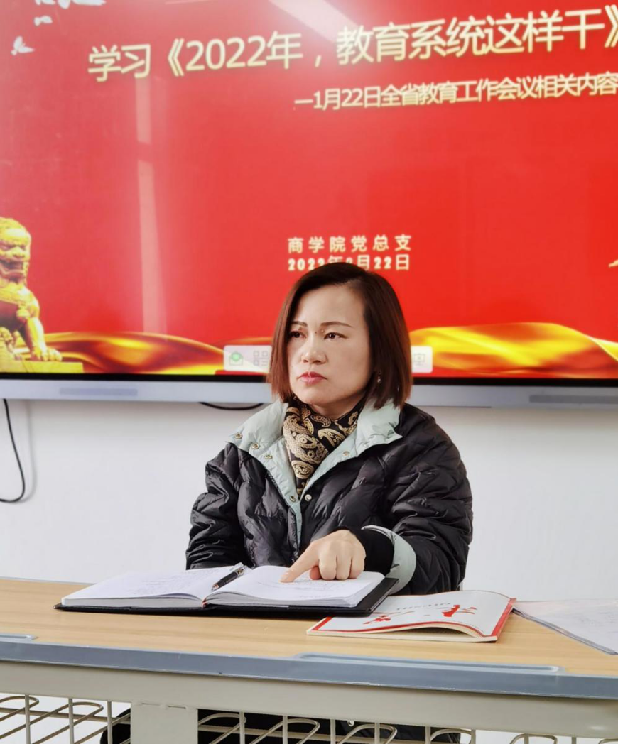 周燕对学习内容进行了解读。她强调习近平总书记在党的十九届六中全会第二次全体会议上的讲话具有很强的政治性、思想性、指导性和针对性,是一篇充满马克思主义真理力量的重要文献。讲话彰显了总书记坚定如山的历史自信,居安思危的历史清醒,强烈进取的历史主动精神,为深入学习贯彻全会精神提供了根本遵循。全省高校2022年工作会议为我们教育工作的重点指明了方向,每一位教师都要认真学习领会会议精神,把握事关高等教育、职业教育工作的的重点。周燕提出作为高校教师,要不断提升自身教学能力、信息处理能力,做好育人工作;要转变思路,提升课程思政能力;要转变作风,提升服务学生能力;要转变思想,提升风险防范意识;要提升业务能力,塑造教师良好形象。