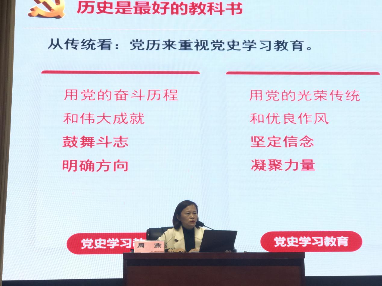 周燕书记从为什么学、学什么、怎么学三个方面深刻阐述了党史学习的重要意义。她讲到在庆祝中国共产党百年华诞的重大历史时刻,在“两个一百年”奋斗目标历史交汇的关键节点,自觉地学好党史是每一位党员的必修课。讲到学党史是以史为鉴,用党的奋斗历程和伟大成就鼓舞斗志、明确方向,用党的光荣传统和优良作风坚定信念、凝聚力量;用党的实践创造和历史经验启迪智慧、砥砺品格。讲到同学们要从党史中汲取精神力量,强大自身修养,牢记党的历史使命,延续革命先辈的道路再创辉煌。