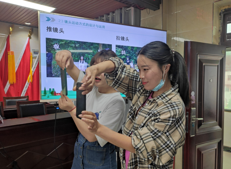 上午,吴昀老师对短视频拍摄和脚本编写技术进行了培训,学员们两两一组进行实操演练,学生助教耐心地对学员进行一对一指导。