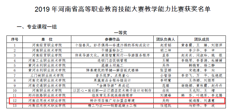 近期,在刚刚结束的2019河南省职业院校教学能力比赛上,我院教师吴昀、侯鸿雁、刘嘉慧三位老师一路披荆斩棘,经过初赛的作品录制、资料准备和复赛的现场说课、讲课、答辩等众多环节后,最终的《特许项目推广与加盟店筹建》作品荣获省级教学能力比赛(专业课一组)一等奖的佳绩。