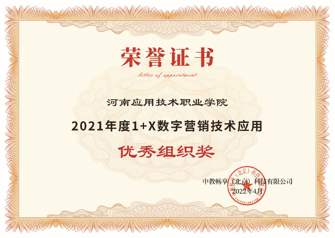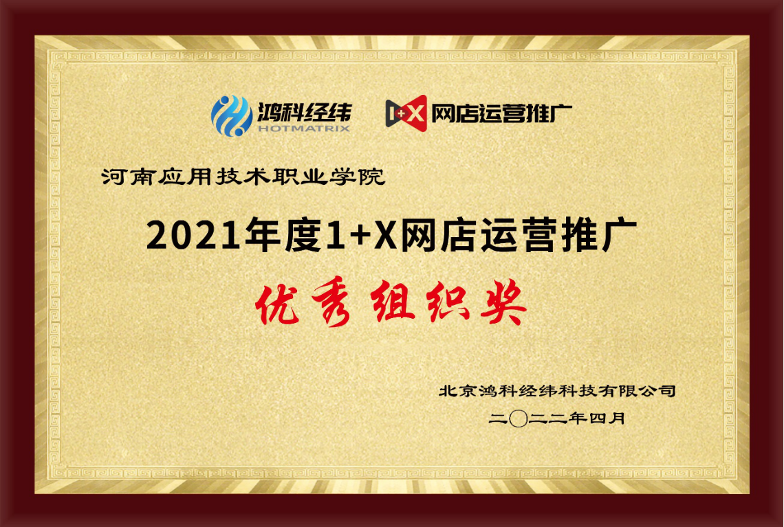 为做好1+X证书培训考核工作,pg游戏电子模拟器7项1+X证书实施“一证一策”、专人负责。在学校的大力支持以及师生的共同努力下,pg游戏电子模拟器喜获2021年度1+X“网店运营推广”优秀组织奖和2021年度1+X“数字营销技术应用”优秀组织奖。