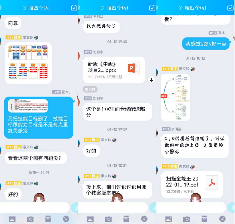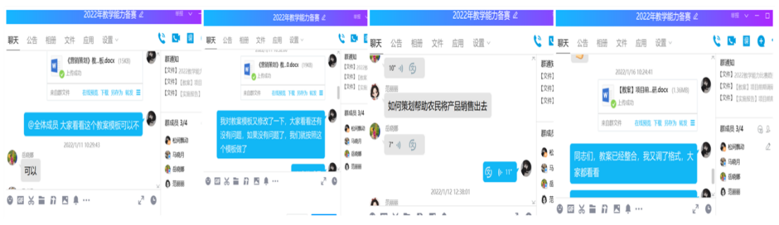 由于疫情的反弹,三个团队利用QQ群、微信、网络会议等形式,深入研究比赛文件,制定参赛方案,反复研讨修改教学设计,不断完善提升参赛资料和教学文件,大到课程整体设计,小到作品中的一幅图及命名,团队成员都积极讨论和研究。