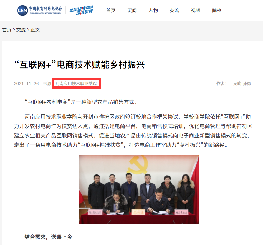 学校坚持走产教融合、校企合作发展之路,以服务地方经济为己任,在电商赋能乡村振兴领域,积极与开封市祥符区政府联动,通过送课下乡、技术助农、青年红旅等方式将学校的专业建设成果为乡村振兴添砖加瓦,得到了乡村政府、居民的一致好评。