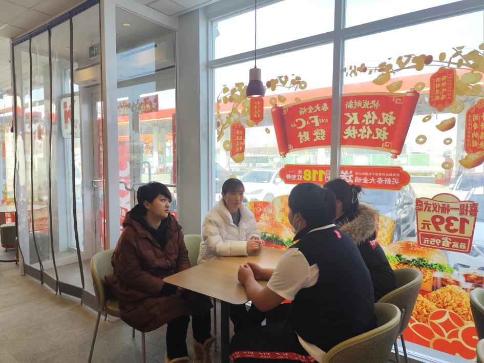 最是情暖岁寒时,一叶一枝总关情。为进一步做好学院拓岗访企和资助育人工作,深入贯彻落实国家和学校的学生资助政策,拓宽学生就业渠道。1月24日,由pg游戏电子模拟器党总支副书记王倩带队,专职辅导员庞轶以及兼职辅导员马晓月前往肯德基商都路博学路中石油店,为正在顶岗实习的家庭经济困难学生送去学校的温暖和新春的祝福。