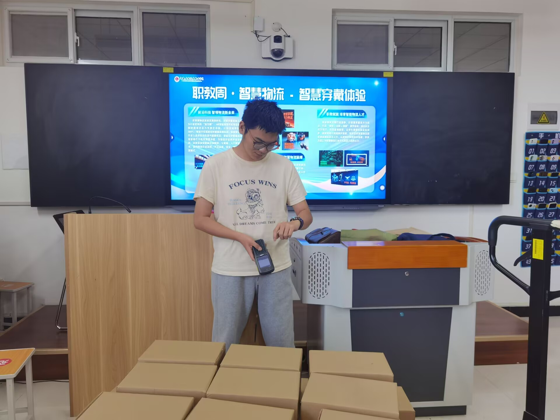 踏入活动现场,物流实训室化身为前沿科技的展示舞台,智慧穿戴和其他一系列设施设备有序陈列,等待着大家去探索。参与体验的同学们纷纷戴上这些设备,开启了奇妙的物流科技之旅。一位同学兴奋地分享道:“戴上这个智能手环,借助它的 AR 功能,仓库布局、货物位置一目了然,物流工作的流程好像变成了一场有趣的游戏,原本那些复杂抽象的概念瞬间变得触手可及,现在我对未来从事物流工作充满了期待!”