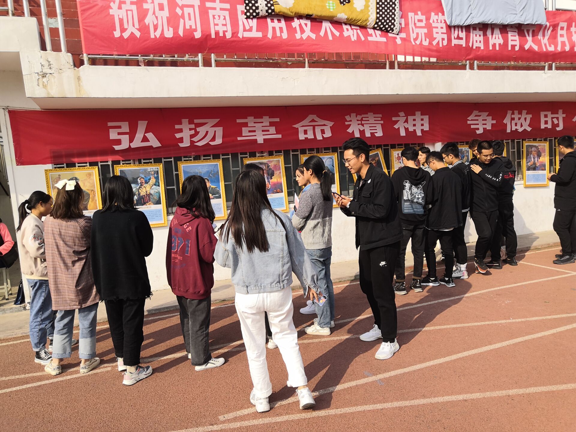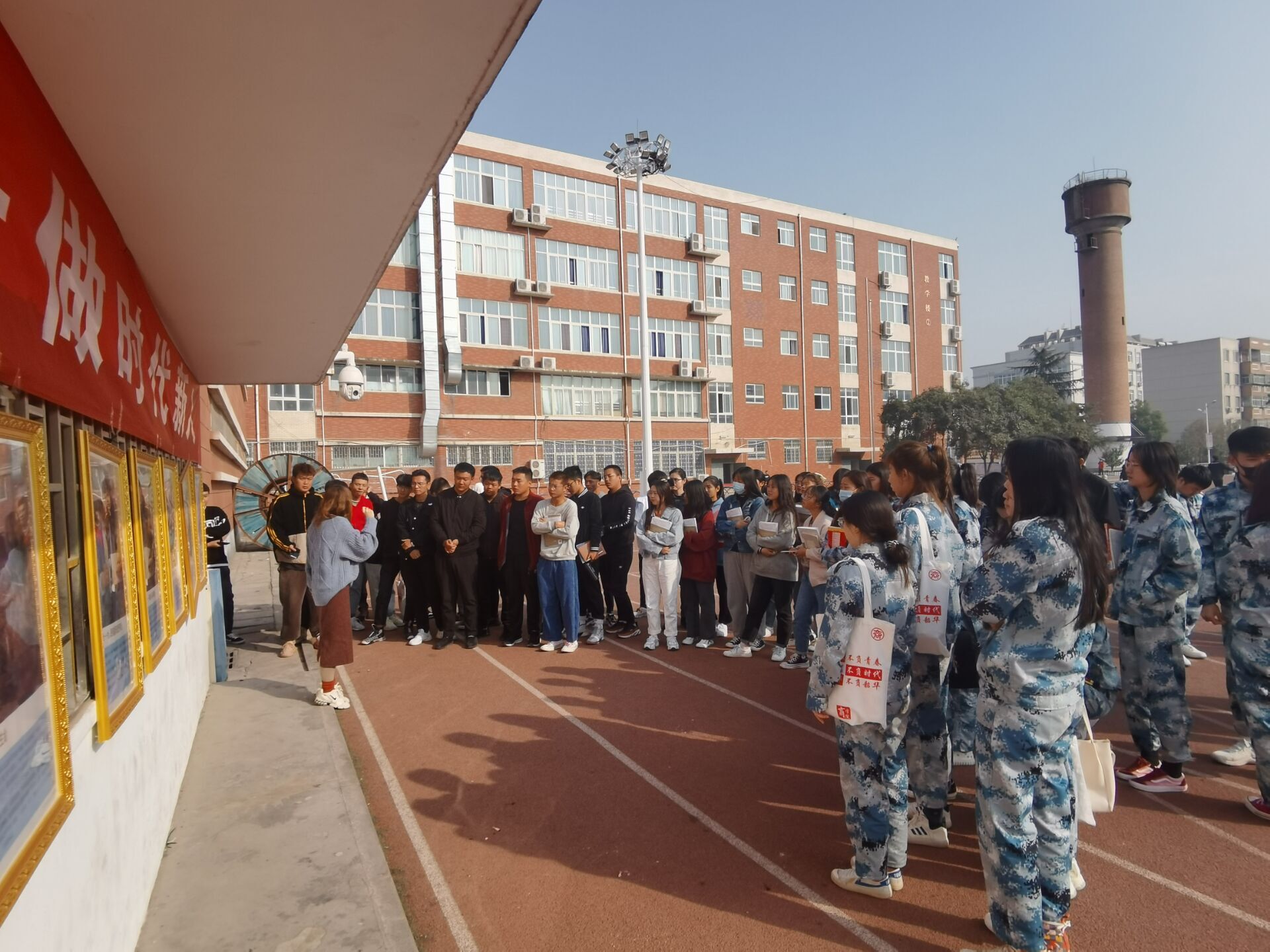 在运动场展架前,李力为同学们讲述了抗战英雄的先进事迹,带领同学们再一次重温了顾全大局、把纪律看的比生命还重要的邱少云事迹,甘于奉献,不求回报的雷锋精神,勇于开拓,忠诚履行使命的模范指挥员杨业功……。她希望同学们要以这些英雄人物为榜样,学习他们坚持理想信念、永葆先进性的政治品格,从先进典型的事迹中汲取精神营养,受到思想启迪,激发学习报国热情。