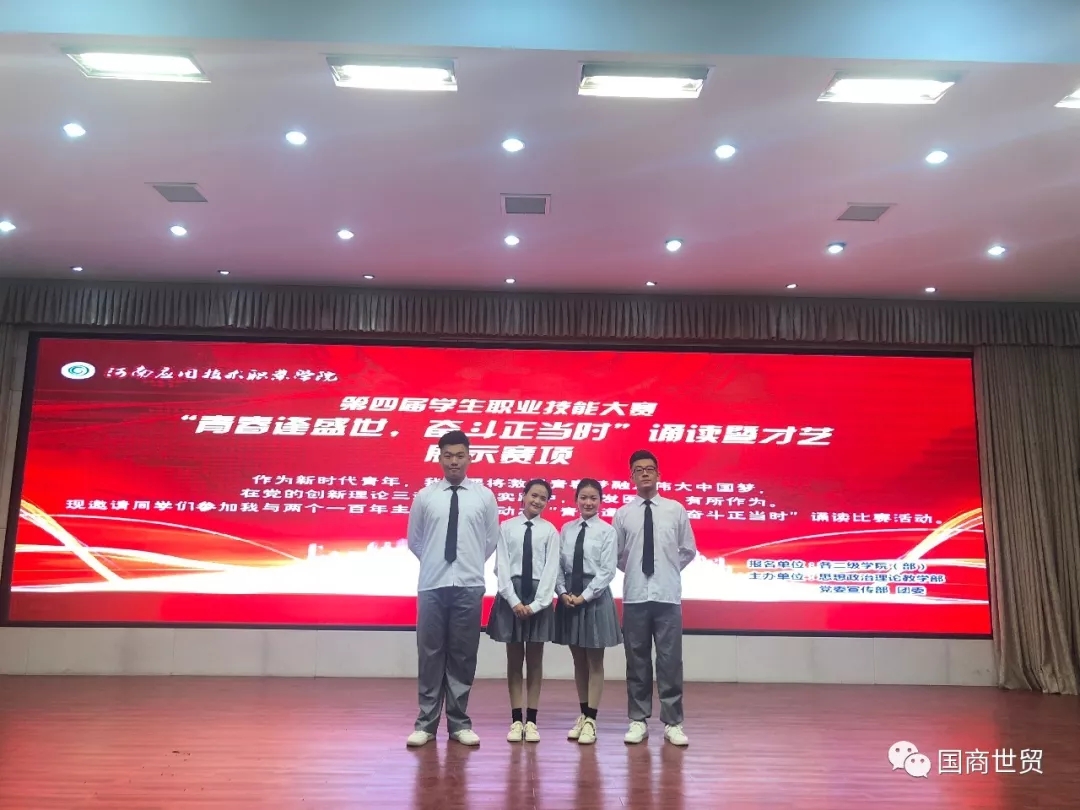 本次朗读比赛在校实训楼二楼会议室举行,共有来自各学院12各代表队参加,赛场上各参赛队激情澎湃,斗志昂扬,整场比赛充满青春的张扬与活力。商贸学院的四名参赛选手分别是:朱攀、黄可洁、朱若愚和李中华,他们顶住压力,以沉稳之风用自己的青春梦、大学梦和中国梦在赛场上展示了一场精彩缤纷的朗诵。从11月中旬准备至今,选手们付出很多,只为上台朗诵的这一刻发出自己对祖国繁盛的激情与感慨,只为表达出自己对青春,对未来,对梦想的执着。而比赛结果是对他们付出的认可和激励,二等奖第六名的比赛成绩,让他们又有了新的追求,下一次更好,更棒。就像他们在朗诵时激动的感慨着:我们将带着智慧和汗水向着我们的大学梦继续前行向着我们的中国梦继续前行!我们每一个人都将继续朝着自己的中国梦砥砺前行,用我们的梦想共同筑建起伟大的中国梦。