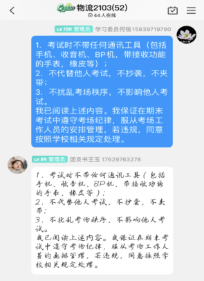 班会上,由辅导员、班主任强调诚信考试的重要意义,对学生提出诚信考试的具体要求,引导学生诚实面对考试,杜绝一切作弊行为;接着班长带领同学们进行诚信考试宣誓;最后团支书带领全班同学仔细阅读诚信考试承诺书并进行接龙。同学们纷纷表示坚决遵守诚信考试承诺,在今后的各项考试中,端正考试态度,维护考试纪律,遵守考试规则,做一名时刻将诚实诚信置于心中的合格大学生。