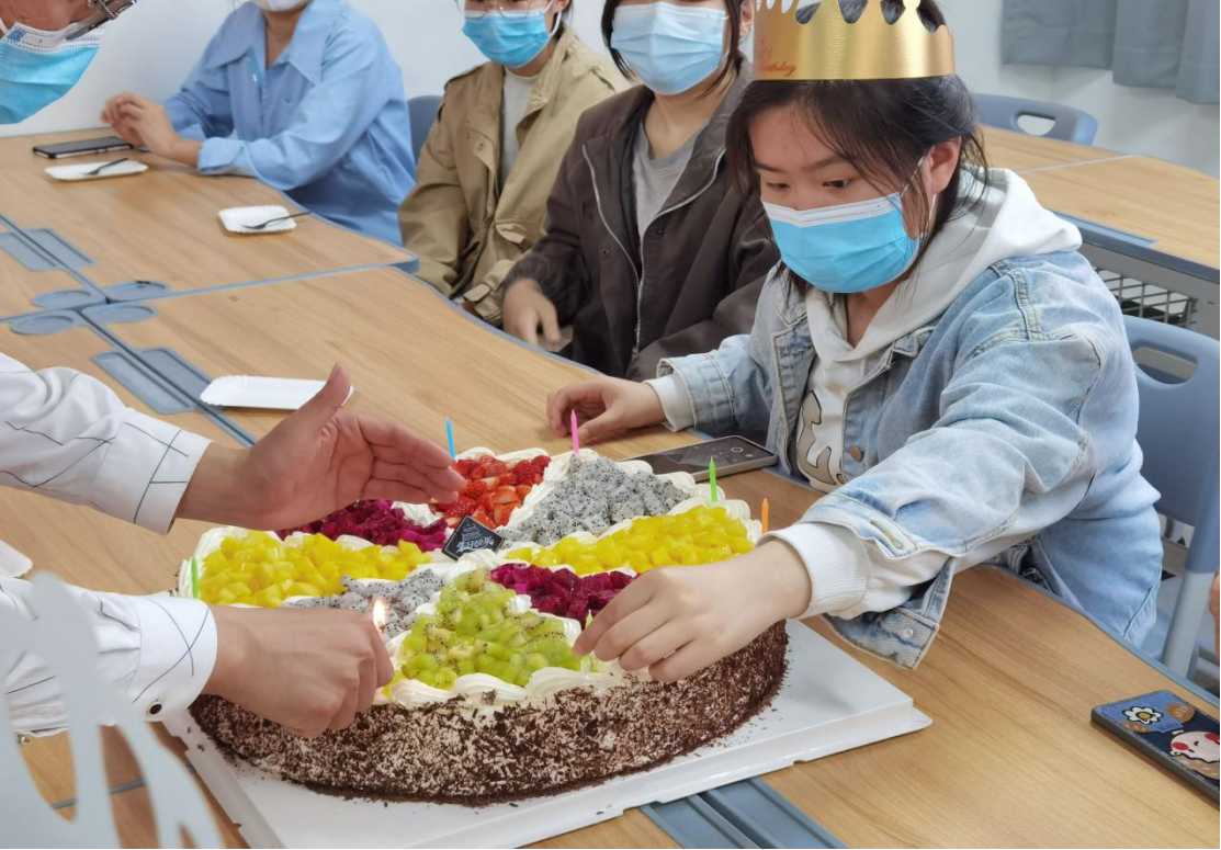 戴生日帽、唱生日歌、点蜡烛吹蜡烛、许生日愿、收礼物收祝福、切蛋糕吃蛋糕,活动室里氛围其乐融融,同学们由拘谨到放开,由惊喜到感动。