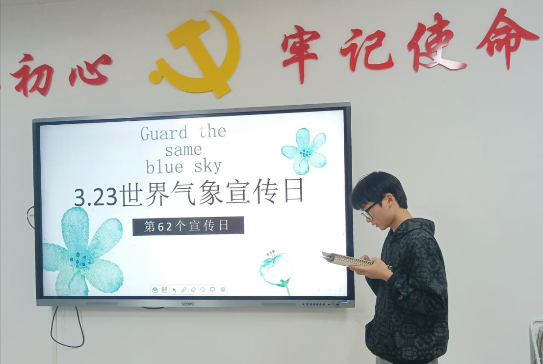 本次活动由学生会干事郑纪源主持,学习内容主要分为以下四个部分:环保的重要性、为什么要保护环境、当前的环境问题、气象灾害的介绍。