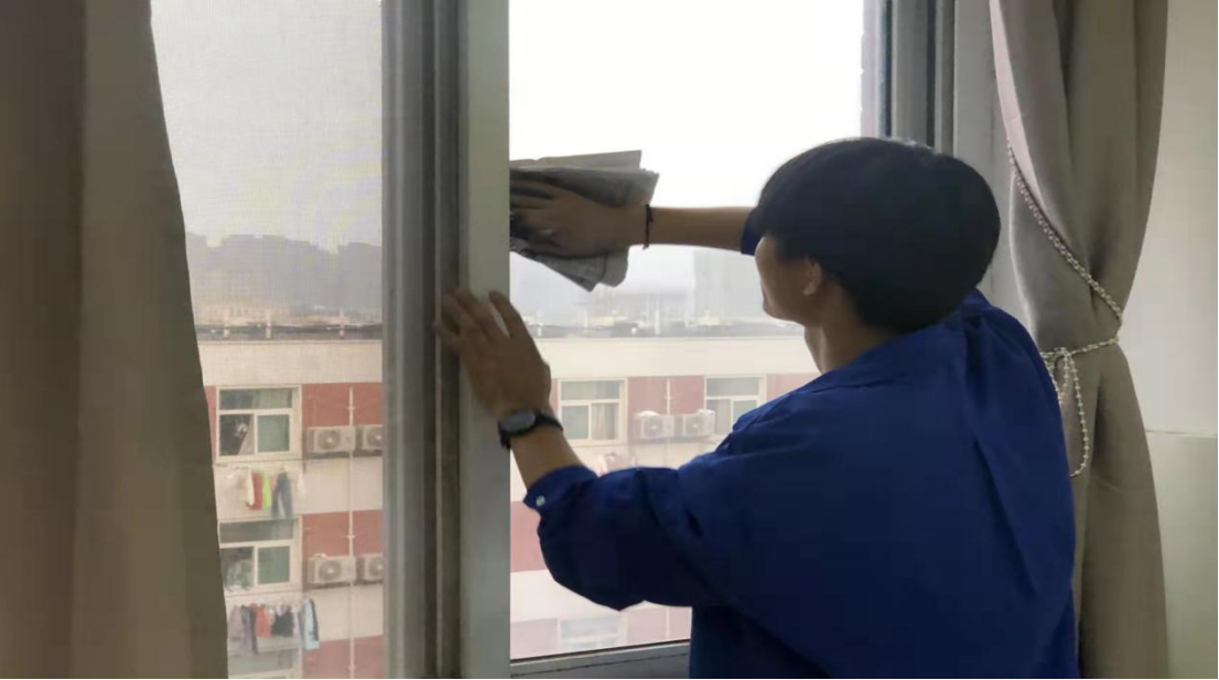 志愿者擦拭实训室玻璃,力求做到窗明几净