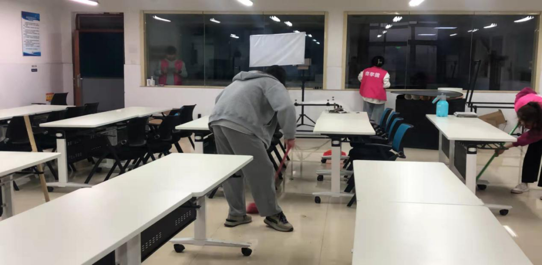 志愿者在打扫实训室地面