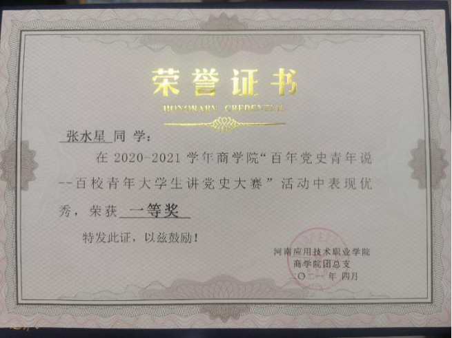 近日,由共青团中央、全国学联指导,中国青年报社、新东方教育科技集团联合开展的2020年度“中国大学生自强之星”评定活动揭晓。经pg游戏官网二级学院初选、校团委推荐、省级初评、全国评审等环节,pg游戏电子模拟器连锁经营与管理专业张水星同学因表现突出,荣获2020年度“中国大学生自强之星”称号。