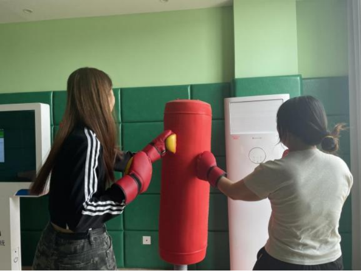 在宣泄室,同学们可以完全放松自己,通过智能呐喊仪、打拳击游戏来宣泄负面情绪的效果,并让同学们感受到情感的宣泄缓解压力。