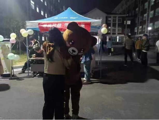 在“爱的抱抱”活动现场,身穿卡通玩偶服的同学向大家招手示意,吸引许多小可爱们前来观看,“大熊”积极地向小可爱们寻求拥抱,小可爱们也毫不吝啬自己的拥抱,纷纷上前。