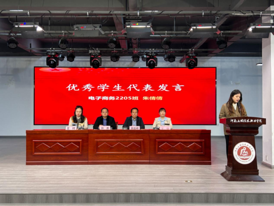 电子商务2205班朱倩倩、营销2303班赵俊涛作为优秀学生代表发言。