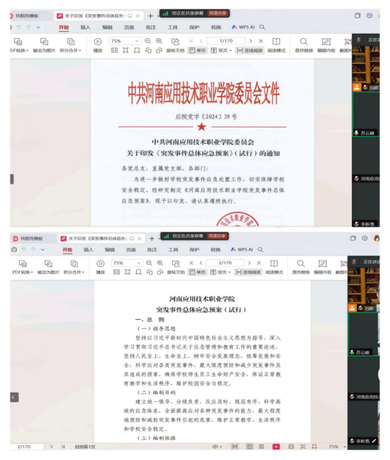 本次线上学习会议详细解读了《应急预案》的制定背景、目的意义及主要内容,还结合实际案例,生动阐述了在突发情况下如何迅速、有效地启动预案,正确运用应对突发事件的预防、预警、应急处置、信息发布和舆论引导、恢复重建等机制。参与学习的教师们纷纷表示,通过此次学习,对《应急预案》有了更加全面、深入地理解,增强了应对突发事件的能力和信心。