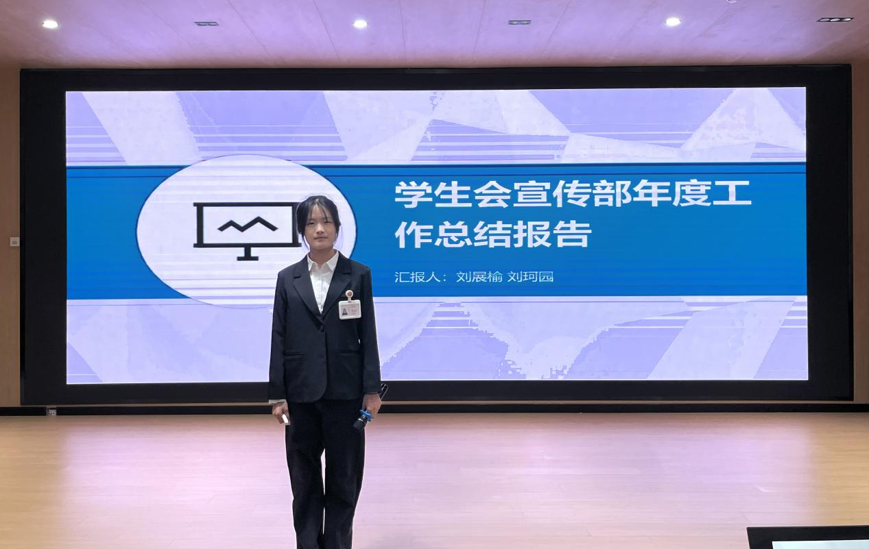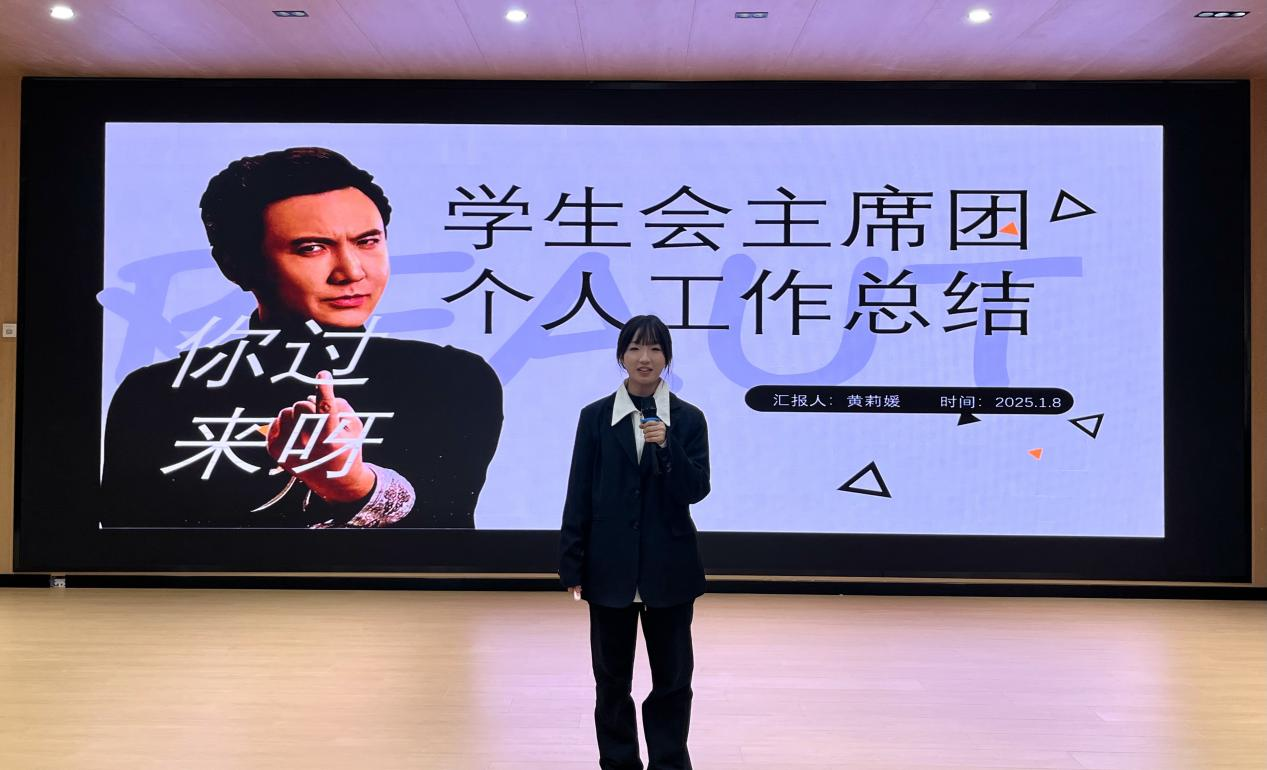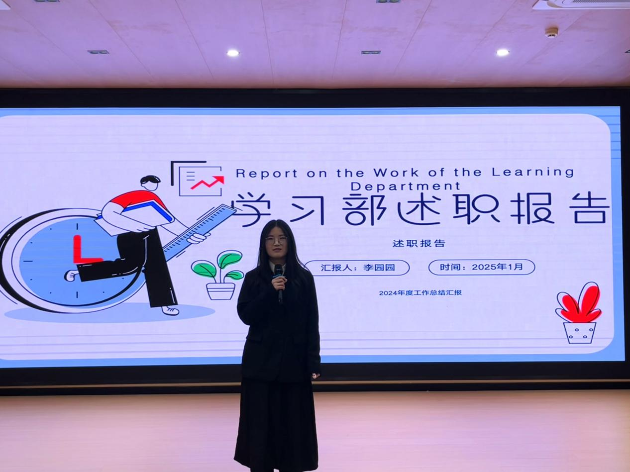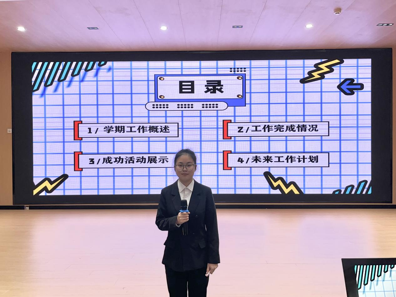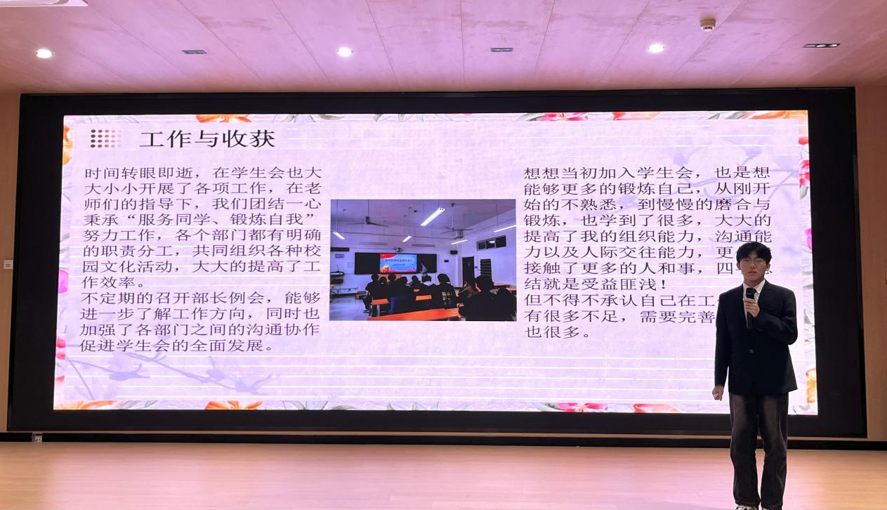 首先,学生会主席团依次做工作报告。主席团以多样的风格详细讲述了学生会本学期的重要活动及主要成绩,在个人方面也讲述了收获与不足。他们表示,下学期将重点侧重在部长素质能力提升,争取取得思想上和能力上的长足进步,让部长们在实习就业中取得优势。