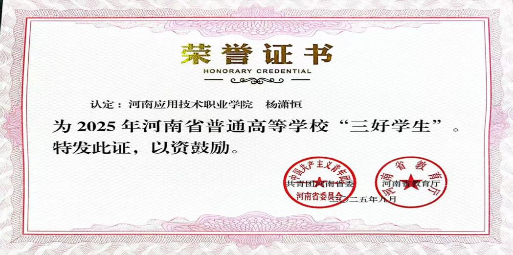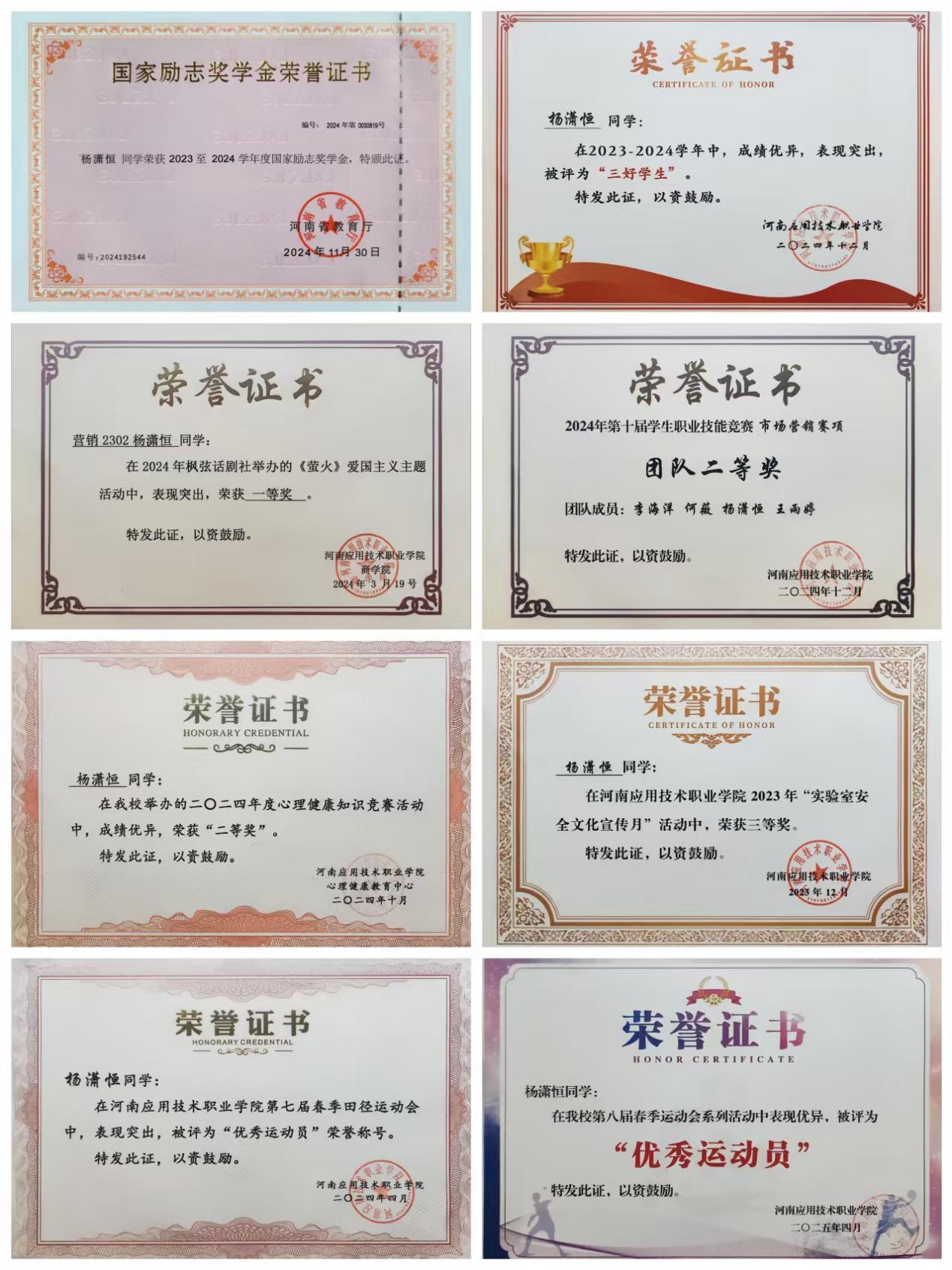 个人简介:杨潇恒,男,2005年3月出生,共青团员,就读于pg游戏电子模拟器pg游戏电子模拟器市场营销专业营销2302班学生,辅导员:贺苗苗。在校期间担任班长、学生会主席、营销沙盘社长等。在学习、工作实践中全面发展,先后荣获校三好学生、省三好学生、暑期三下乡优秀个人、国家励志奖学金、“挑战杯”河南省大学生创业计划竞赛银奖等。