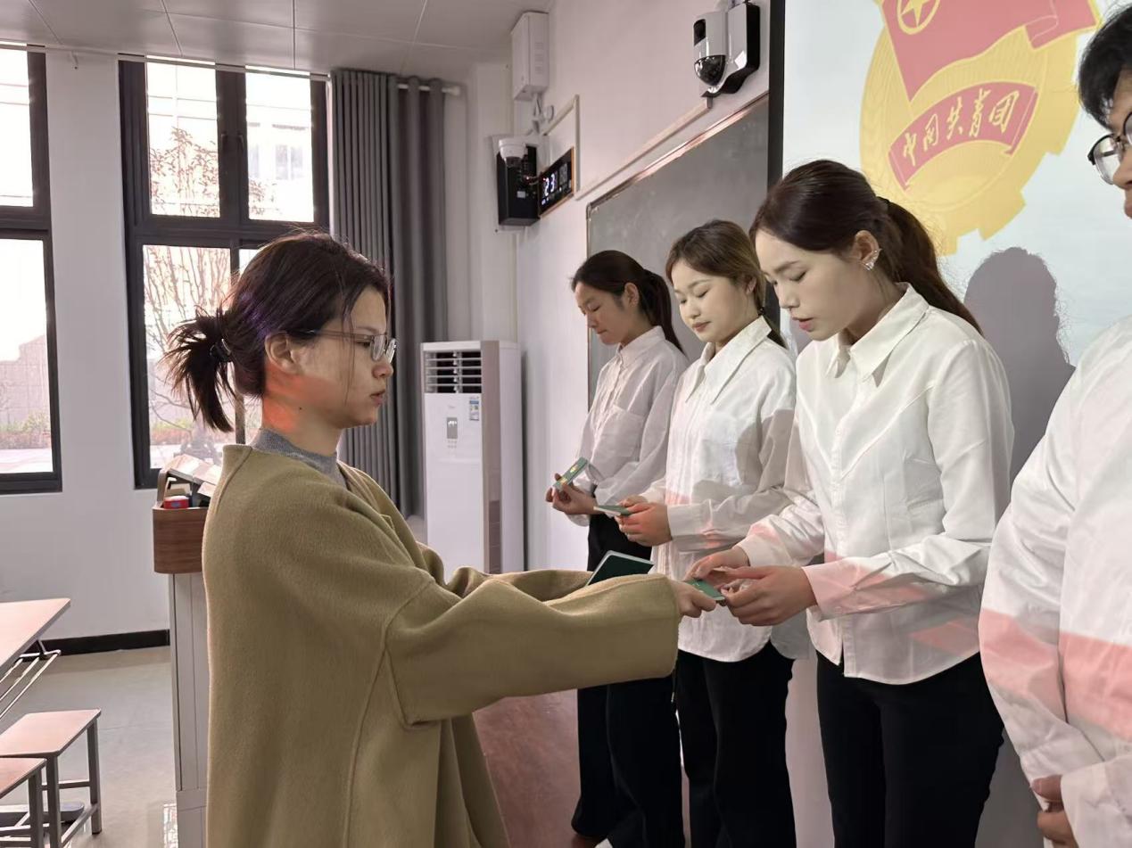 在庄重的气氛中,仪式进入第三项,贺苗苗老师、董会老师为每一位新团员颁发团员证。团员证不仅是团员身份的证明,更象征着蓬勃的生机与沉甸甸的责任。
