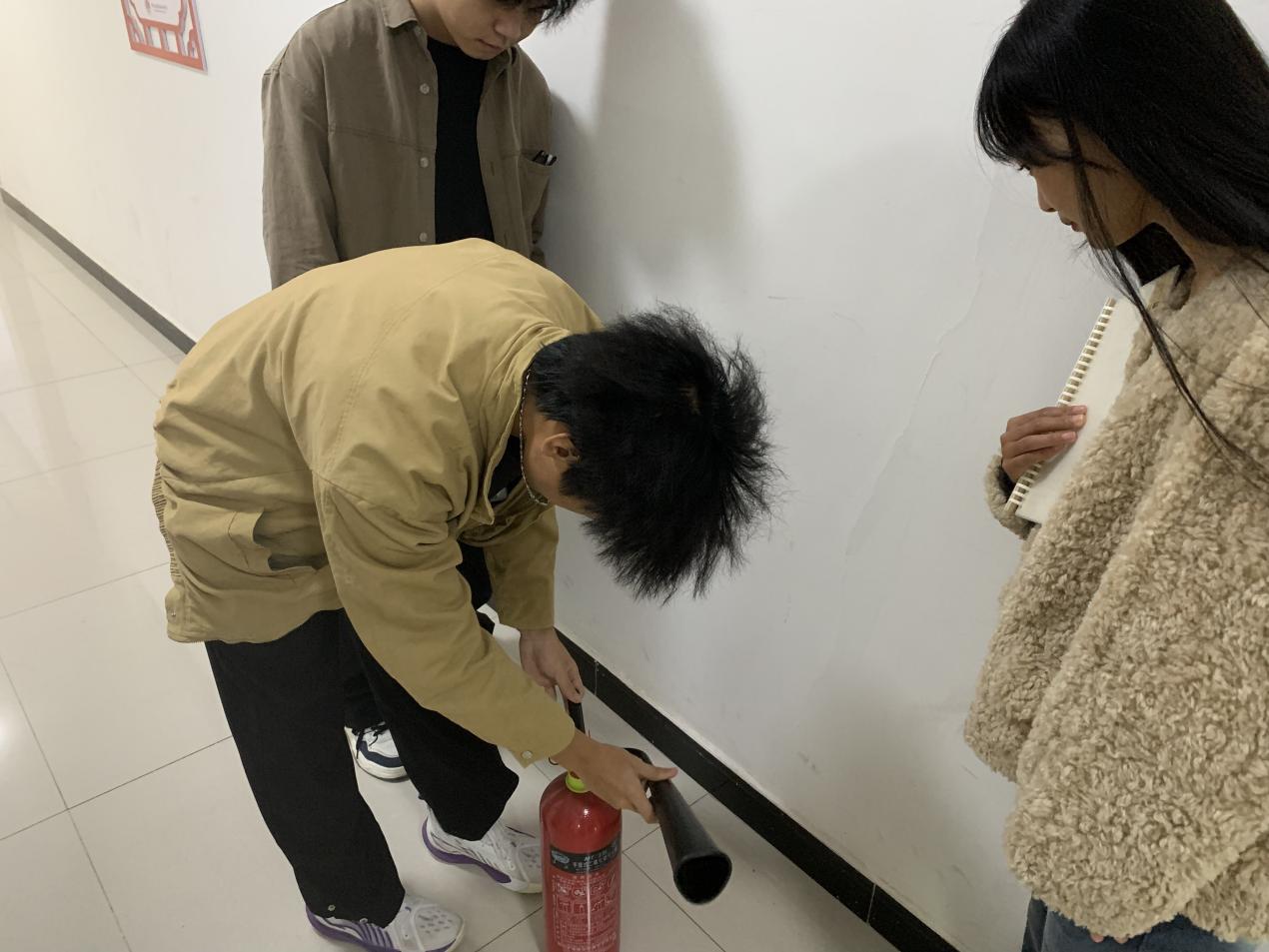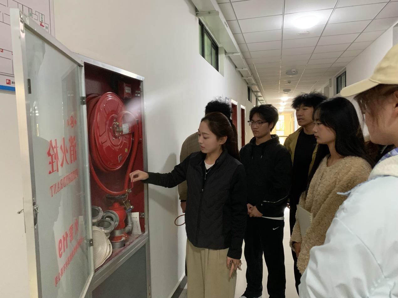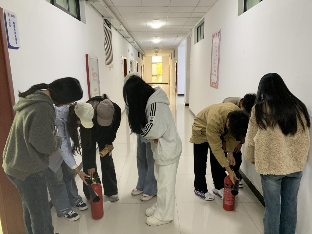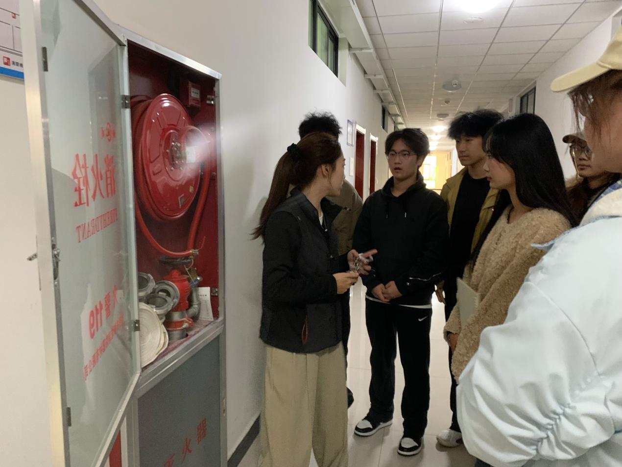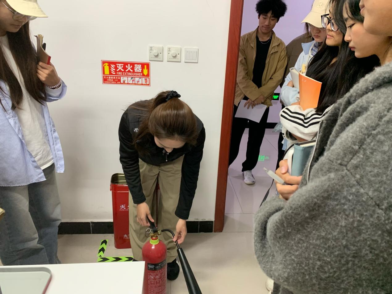 活动现场,同学们先后走进物流仿真实训室、直播间、电子商务沙盘实训室等教学场地,围绕不同场地的消防风险点、特殊消防注意事项,以及灭火器、消火栓等器材的基础使用知识展开学习,深刻领会“预防先行”“小火会灭”“大火会逃”的消防核心要义;随后在实训室管理员带领下,大家实地查看pg游戏电子模拟器实训教室各楼层及楼梯间灭火装备,管理员同步详细讲解墙壁消火栓、应急灭火箱的功能作用及消防水带的存放位置与取用规范,并组织学生分组开展灭火器实操练习——从提握灭火器的正确姿势、保险销的拔除方法,到对准火源根部按压喷射的操作要点,管理员全程逐项示范、反复强调规范,引导学生树立消防实战意识,确保每位同学都能熟练掌握操作技巧,切实将“小火会灭”的技能落到实处。