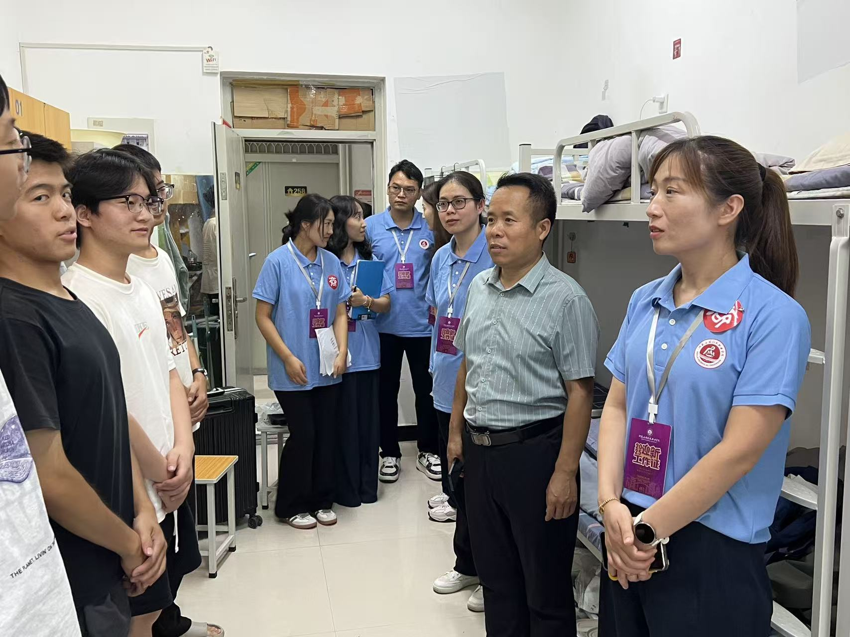 走访过程中,学院领导老师首先对同学们开启大学生活表示祝贺。在与新生的交流中,亲切询问同学们的住宿环境、适应情况、饮食是否习惯、行李物品是否齐全,细致查看宿舍的设施配备等情况,叮嘱同学们若遇到宿舍设施故障、生活不便等问题,要第一时间通过辅导员反馈,学院会全力协调解决,为大家营造安全、舒适的居住环境。