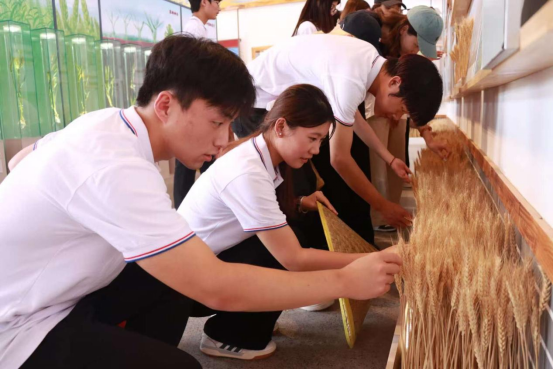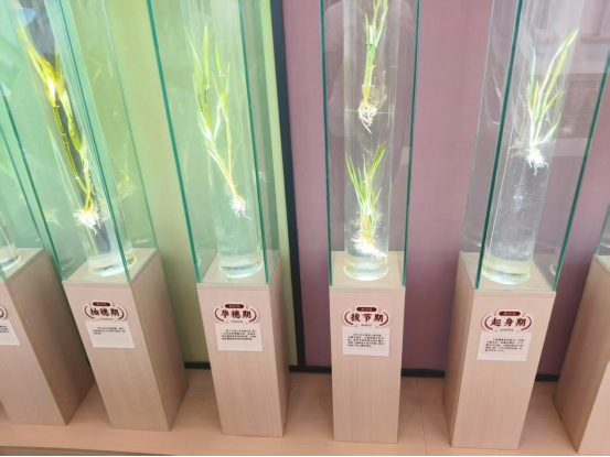 在展示区一排玻璃容器内,冬小麦在不同生长时期的标本静静陈列,从起身期那嫩绿的新芽奋力钻出土壤,到拔节期茎秆节节攀升,再到孕穗期孕育着丰收的希望,直至抽穗期麦穗初显锋芒,每一个阶段都记录着生命的奇迹。随后,志愿者们纷纷俯下身,轻轻触摸那饱满的麦穗,感受着丰收的质感,触摸着现代农业结出的硕果。