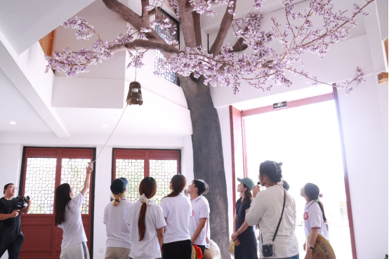在木铎湾·学用馆,踏进展馆映入眼帘的便是一个具有年代感的“铎”。【仪封人请见,曰:“君子之至于斯也,吾未尝不得见也。”从者见之。出曰:“二三子何患于丧乎?天下之无道也久矣,天将以夫子为木铎。”】在讲解员的引导下,王雨亭等同学纷纷尝试将其敲响。当麻绳在手中不断摇晃,当绳头的铎舌不停撞击铎身,古老的回响在寂静中荡开,响彻整个丰收馆。这“响”声里,有对先辈实干的敬意,更藏着年轻力量接棒乡村振兴,要让这份“铎声”穿透当下、传向更远未来的决心。