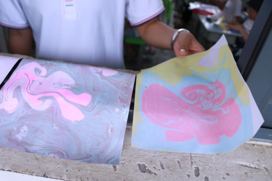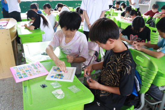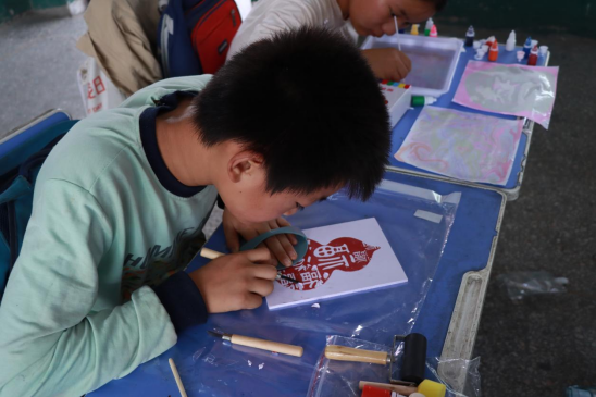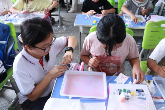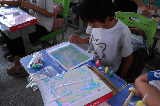 志愿者们带领五年级同学开展手工拓印和水拓画活动,拓印时与古老技艺对话,水拓画则让他们惊叹于水中纹理的奇妙。孩子们充分发挥想象力,将对美好生活的向往融入作品中,一张张稚嫩的脸上洋溢着创作的喜悦。