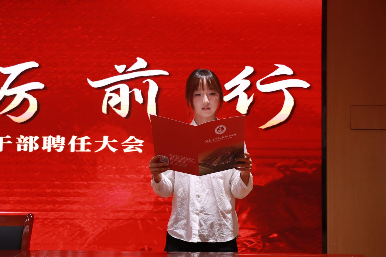 新老学生干部代表先后发言,2023级学生干部代表黄莉媛以“服务中践行成长”为核心,分享了带领团队推进师生协作的实践经历,强调学生干部需以担当为纽带,搭建好师生沟通桥梁;2024级新任学生干部代表张彤从学生会职能认知、未来工作规划及职业态度三个维度庄严表态,承诺以务实作风接棒使命,展现新生代的责任担当。