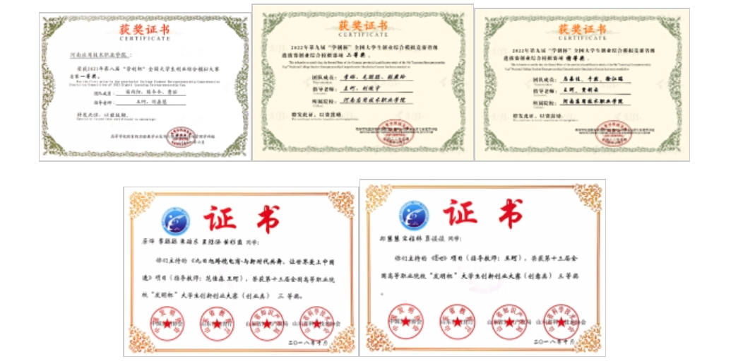 2021年、2022年“学创杯”全国大学生创业综合模拟竞赛,省级选拔赛创业综合模拟赛项获:特等奖、一等奖和二等奖。