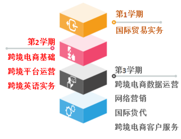 核心专业课程:国际贸易实务、跨境电子商务基础、跨境平台运营与管理、跨境电商数据运营、跨境英语实务、网络营销、国际货代、跨境电子商务客户服务;一般专业课程:管理学、国际市场营销、跨国文化沟通与谈判、电子商务技能训练、跨境电子商务与物流、商务礼仪、经济学基础、电子商务视觉设计、消费者行为学、电子商务创业项目设计与实施、商务数据分析与应用、新媒体运营、电子商务法律法规、电子支付与安全等。
