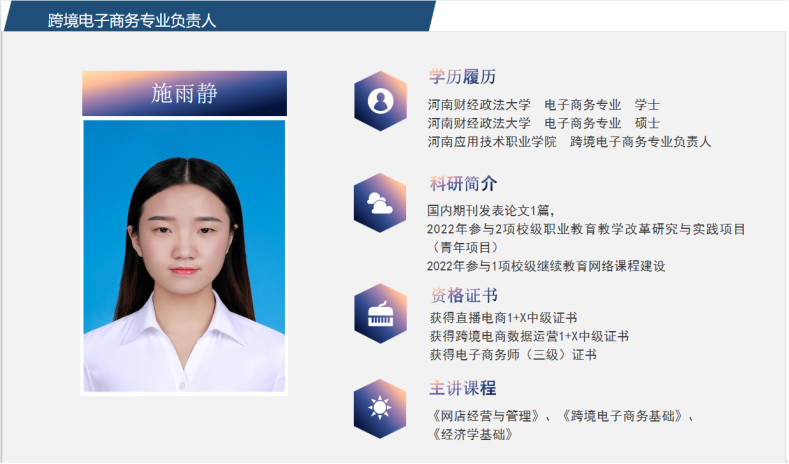 跨境电子商务方向成立于2019年,2020年正式获批成为独立专业,拥有网店运营推广实训中心、新媒体营销实训中心、商务数据分析实训中心、商品采编实训中心、跨境电商实训中心;跨境电商B2B数据运营1+X证书试点单位、考核站点。