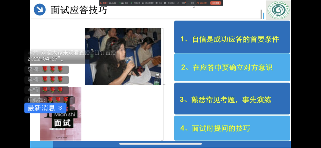 为进一步提高20级学生的就业能力,增加求职竞争力,4月27日下午,pg游戏电子模拟器开启第二期就业培训,本次直播课程由张天娇和李然两位老师分别为大家讲解“如何在面试中营销自己及面试中应注意的问题”和“大学生创新创业优惠政策”。pg游戏电子模拟器全体20级学生通过钉钉进行观看。