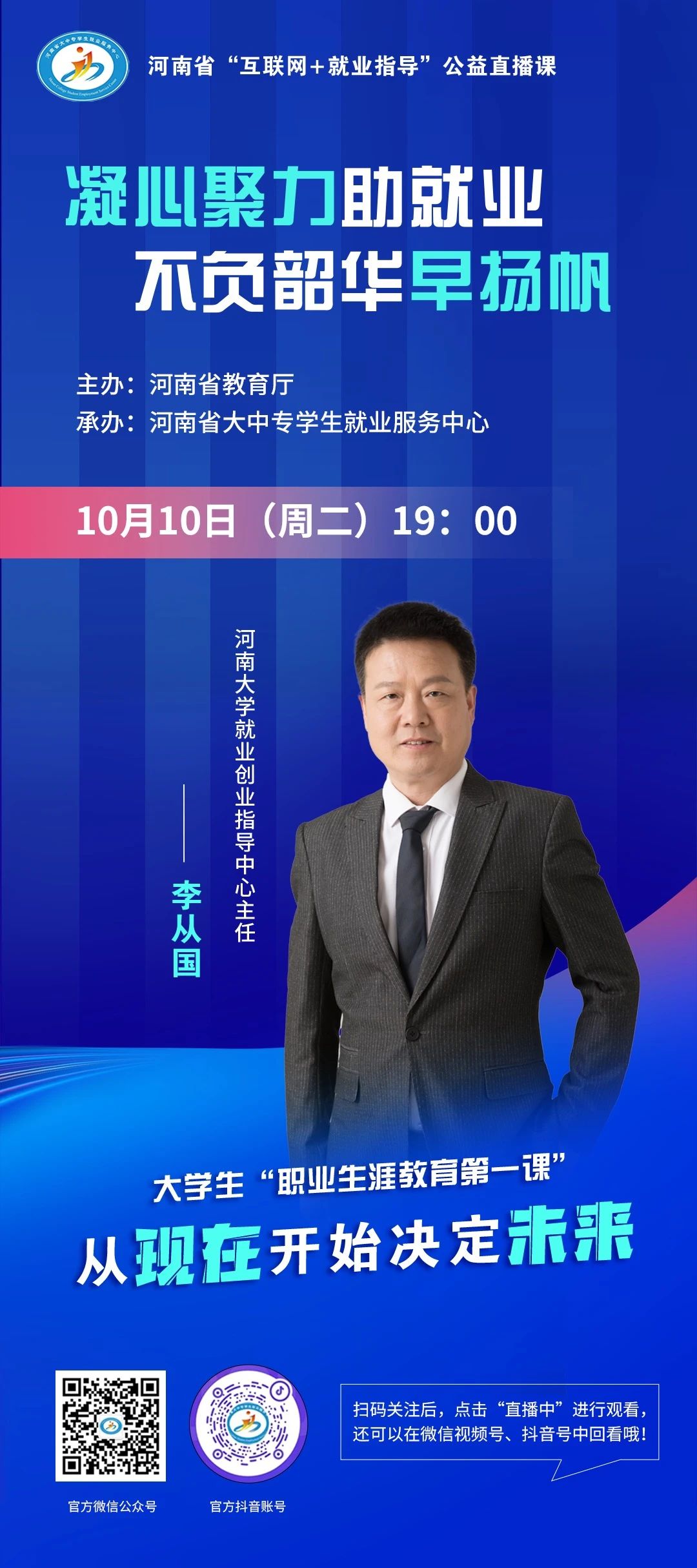 为落实教育部关于首届全国大学生职业规划大赛的工作部署,省教育厅积极开展大学生职业生涯教育系列活动。本期推出“大学生职业生涯教育第一课”,这既是大一新生开启大学职业生涯教育的第一课,也是全体在校大学生新学期的职业生涯学习课堂。10月10日(周二)晚19点,让我们一起聆听河南省高校就业指导教育教学专家、省大学生创业指导名师、河南大学就业创业指导中心主任李从国教授“职业生涯教育第一课”,让我们不见不散!